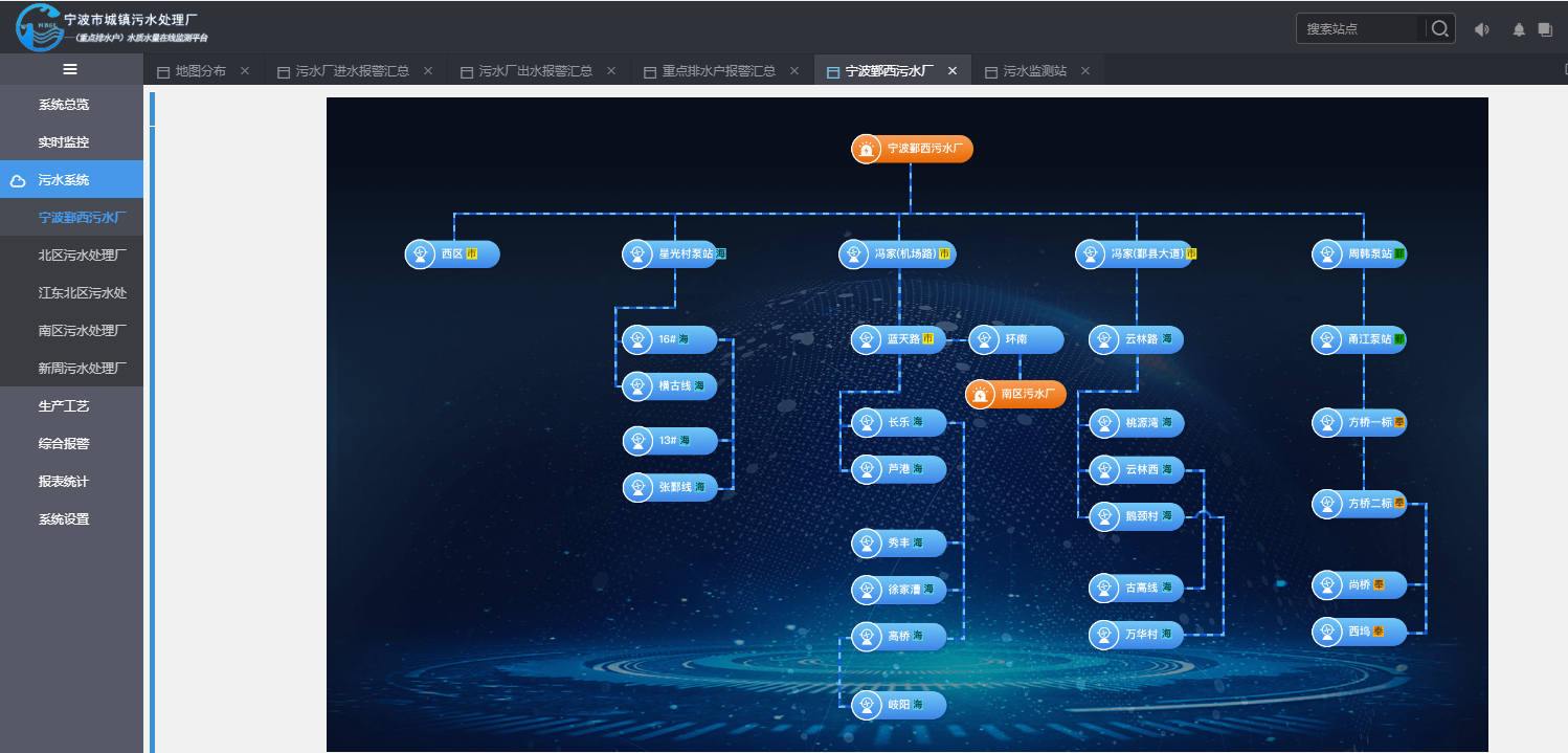 對轄區(qū)范圍內(nèi)的城鎮(zhèn)污水處理廠進(jìn)行管理,結(jié)合污水管理需求,開發(fā)污水廠站點管理、污水廠進(jìn)出水報警、各級污水廠實時數(shù)據(jù)監(jiān)控、污水系統(tǒng)統(tǒng)計、生產(chǎn)工藝展示、污水廠巡檢等功能,實現(xiàn)城鎮(zhèn)污水系統(tǒng)的高效在線化管理。