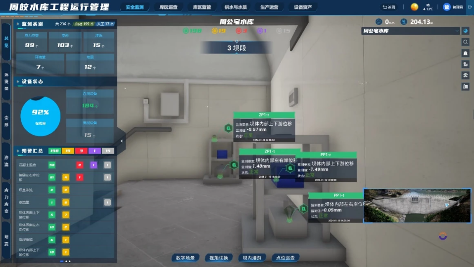 水庫大壩是流域防洪工程體系重要組成部分,是保障水安全的“重器”。數(shù)字孿生周公宅-皎口梯級(jí)水庫系統(tǒng)利用高精度模擬仿真引擎1:1構(gòu)建水庫大壩可視化模型和工程安全監(jiān)測(cè)分析模型,全面監(jiān)控、深入分析水庫環(huán)境量、變形、滲流、應(yīng)力應(yīng)變、地震等安全要素,逐時(shí)分析大壩的各項(xiàng)安全指標(biāo),直觀展示大壩的安全狀態(tài)。