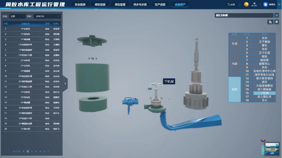 依托BIM仿真建模技術(shù),數(shù)字孿生周公宅-皎口梯級(jí)水庫系統(tǒng)實(shí)現(xiàn)了對(duì)水庫重要設(shè)備資產(chǎn)的精細(xì)管理。結(jié)合監(jiān)測(cè)監(jiān)控?cái)?shù)據(jù),實(shí)時(shí)掌握水庫防洪、供水、發(fā)電的運(yùn)行狀況,保障水庫安全高效運(yùn)行。同時(shí),利用BIM技術(shù)對(duì)水輪機(jī)、發(fā)電機(jī)等重要機(jī)電設(shè)備進(jìn)行零部件級(jí)的拆解,“再現(xiàn)”設(shè)備的內(nèi)部機(jī)構(gòu)和狀態(tài)。這一技術(shù)幫助水庫工作人員直觀、深入地了解設(shè)備的運(yùn)行原理與機(jī)制,為設(shè)備的精細(xì)管理及維修養(yǎng)護(hù)提供重要支持,也大幅提升了水庫設(shè)備管理的智能化水平。