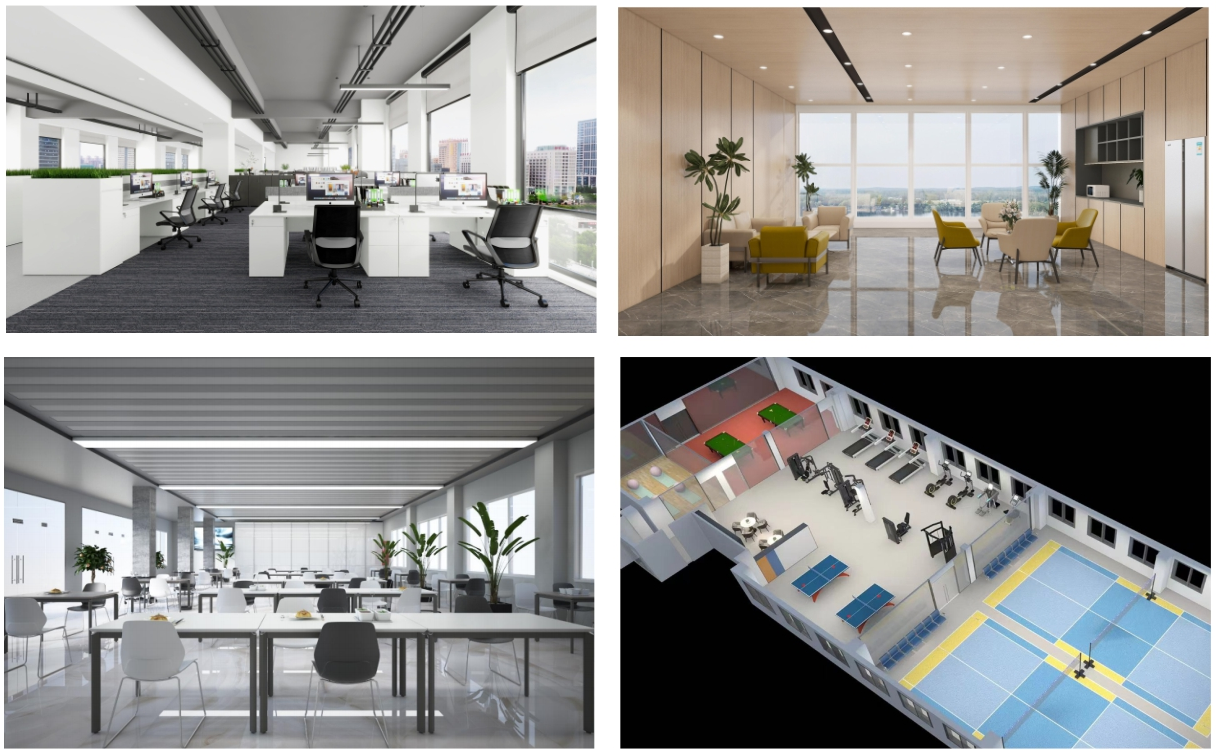 ▲辦公區(qū)、休閑區(qū)、用餐區(qū)、健身區(qū)環(huán)境效果圖
