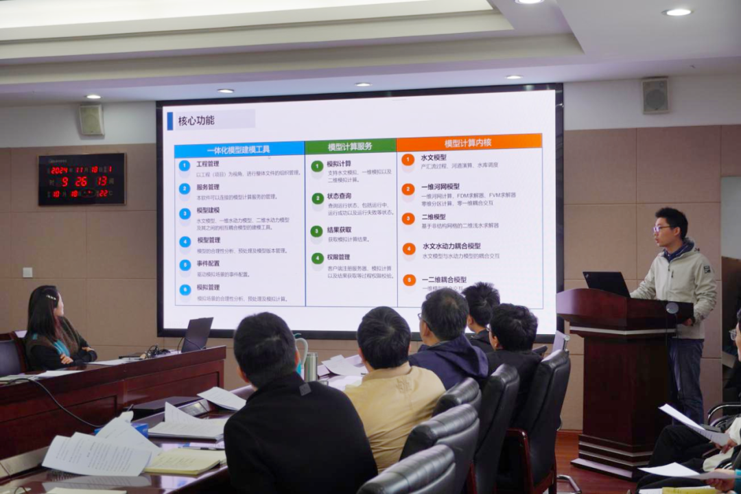 隨后,平臺研發(fā)團隊代表陳龍贊對“澤圖水文水動力一體化模型平臺”進行詳細介紹,并進行現(xiàn)場實操演示。該平臺是一套我院自主研發(fā)的以組件化建模、并行化求解、在線化計算、一體化耦合、國產(chǎn)化支持為核心的水文水動力模型平臺,能夠滿足包括產(chǎn)匯流計算、水庫調(diào)度、一維河網(wǎng)、二維淹沒、水文水動力耦合、一二維水動力耦合在內(nèi)的多種模擬需求,適用于獨立部署、嵌入第三方項目等多種應用場景?;诮9ぞ摺⒛P头?、計算核心三分離的設(shè)計架構(gòu),平臺具備分布式部署、集群化管理、多節(jié)點負載均衡的動態(tài)能力,滿足靈活適用多種尺度的計算需要。